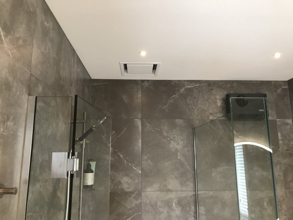 - The unit is presented to the ceiling, the flexible duct is pulled down through the frame and attached to the central plaque and spigot